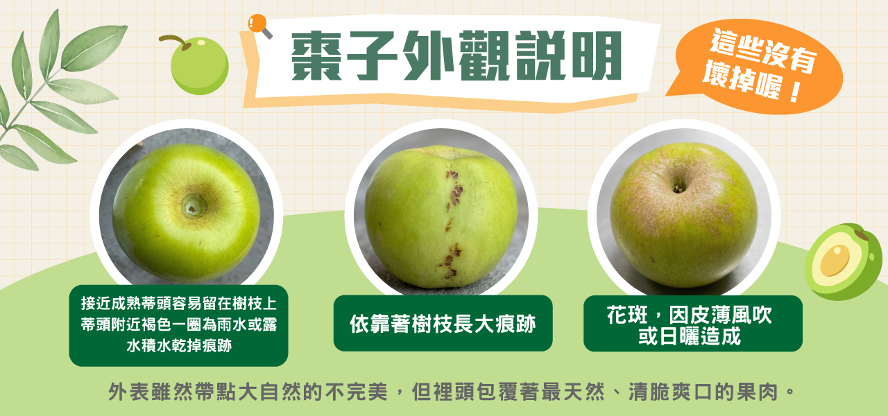 因採無毒友善方式種植,果皮表面有些許瑕疵屬正常現象,但不影響內部果肉品質,請安心食用